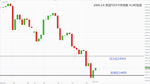 美国TECH100指数:轻仓偏空操作,空单参考价位24700,止损位24900,获利目标24400附近。