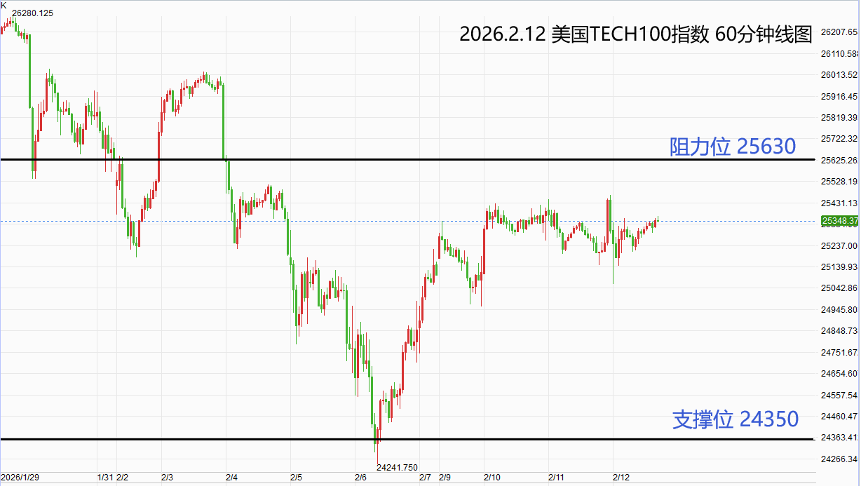 美国TECH100指数:激进者偏空操作,空单参考价25450-25500,止损位25630,获利标24350附近/以下。