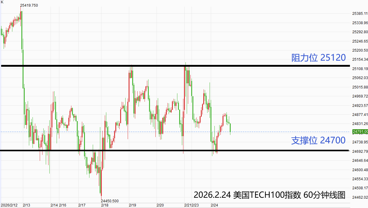 美国TECH100指数:激进者偏空操作,空单参考价24980-25050,止损位25120,获利标24700附近/以下。