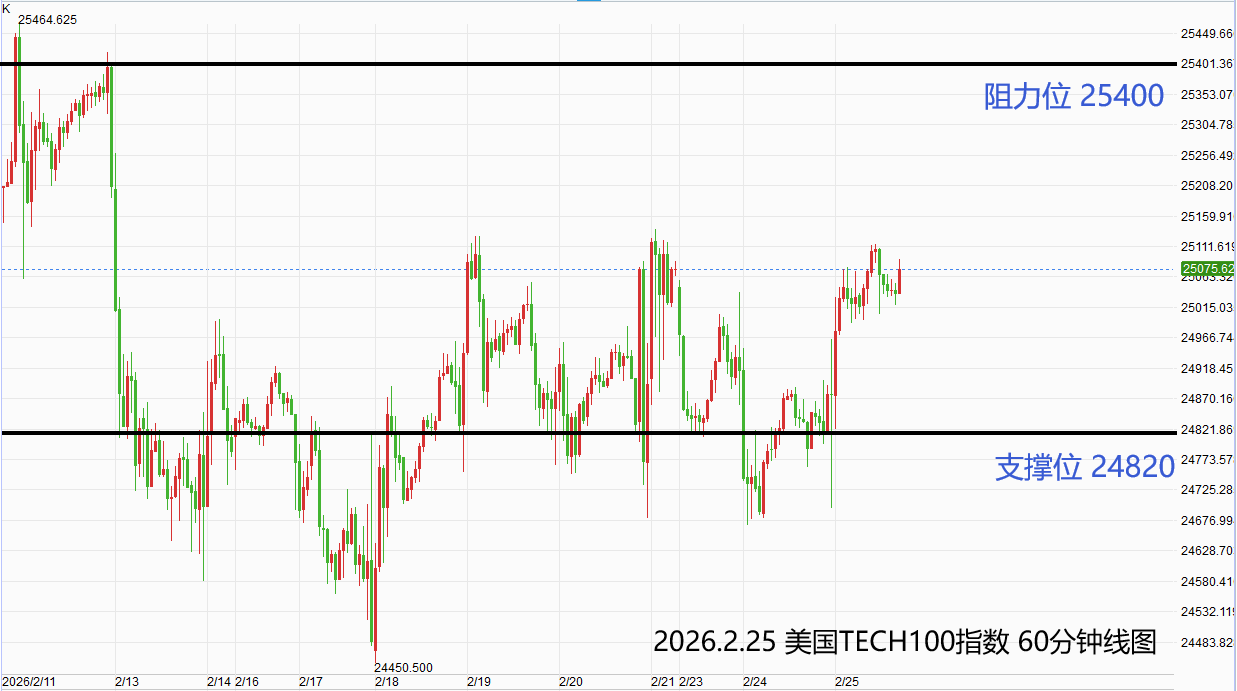 美国TECH100指数:激进者偏多操作,多单参考价24920-24970,止损位24820,获利标25400附近/以上。