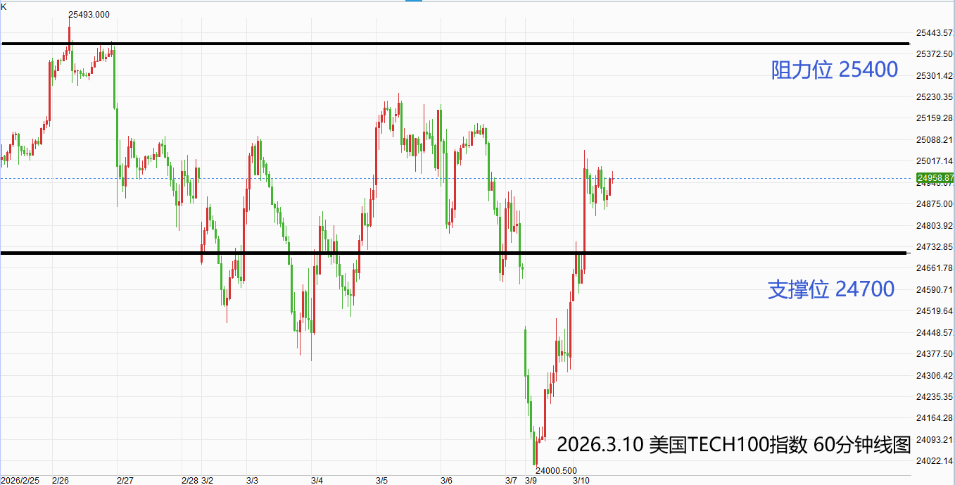 美国TECH100指数:激进者偏多操作,多单参考价24850-24900,止损位24700,获利目标25400附近/以上。