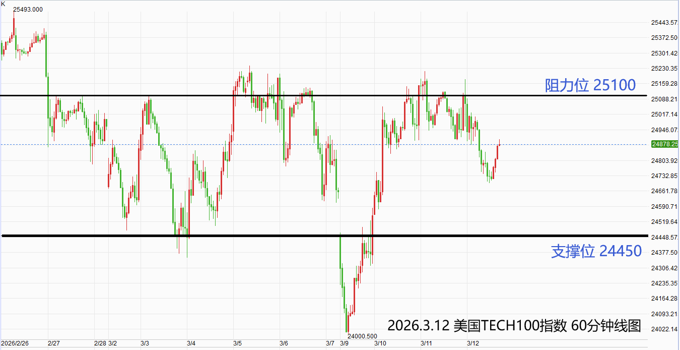 美国TECH100指数:激进者偏多操作,多单参考价24550-24600,止损位24450,获利目标25100附近/以上。