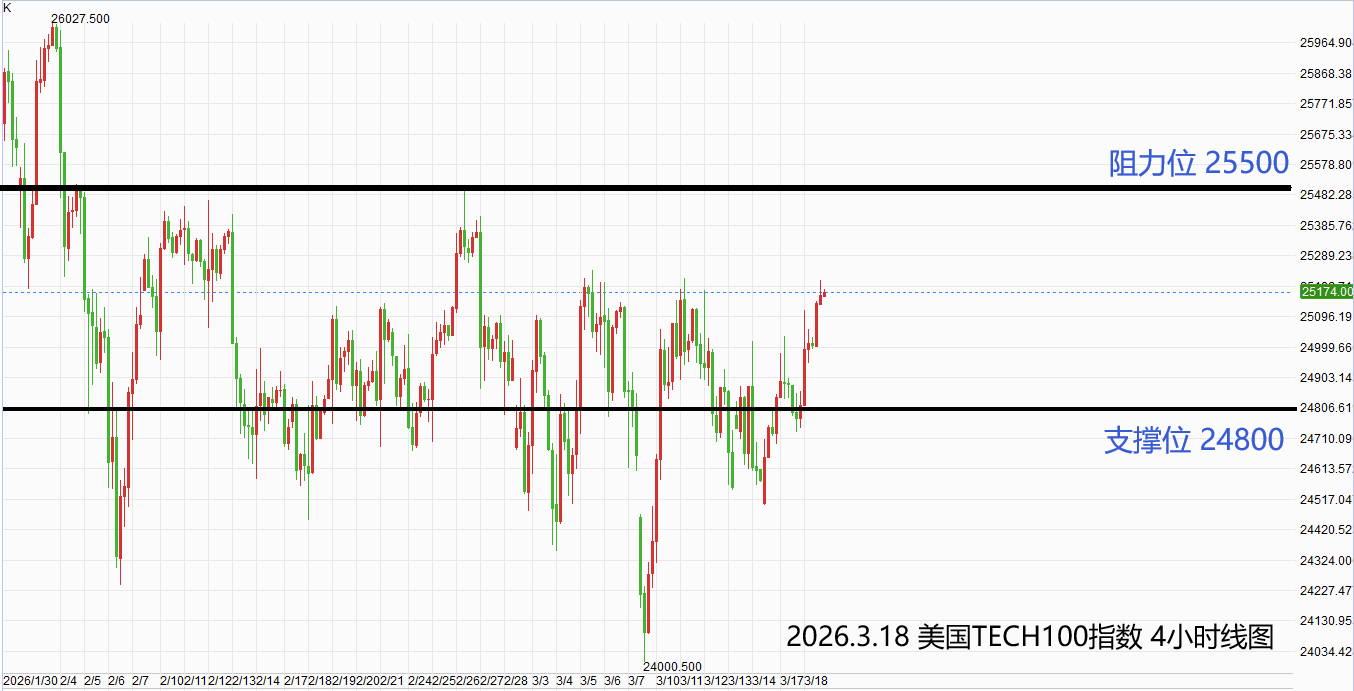 美国TECH100指数:激进者偏空操作,空单参考价25400-25420,止损位25500,获利目标24800附近/以下。