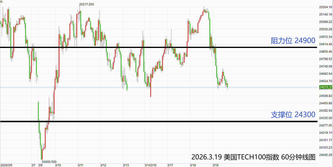 昨日美股上冲下洗后收跌,主要受到伊朗局势与美联储利率决议影响。笔者认为,伊朗攻击喊湾国家能源设施,美国与以色列亦攻击伊朗能源设施,让油价与天然气上涨,利空股指。晚间鲍威尔部份观点偏向鹰派,超出市场预期的中性立场,相对利空股指。短线关注伊朗局势引起的油价波动外,若晚间费城联储制造业指数通胀数据强劲,暗示通胀数据强劲,或加深市场对于滞胀担忧(尤其在昨日生产者物价指数通胀高于预期下)。整体而言,建议美国TECH100指数稳健者观望,激进者高空低多操作。