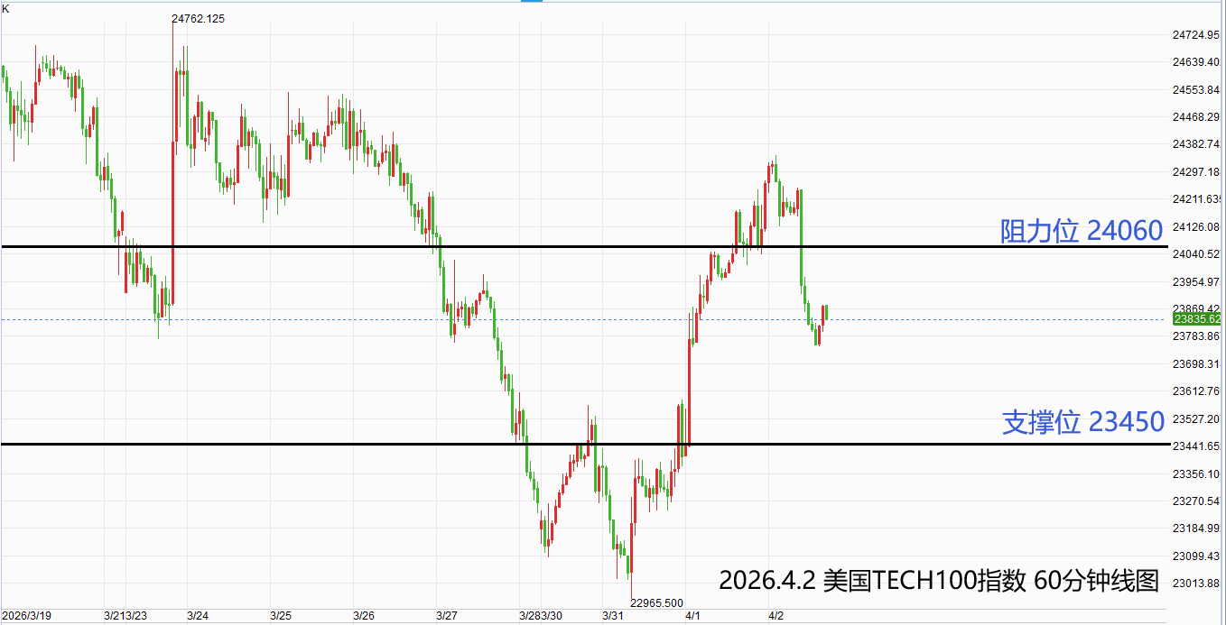 美国TECH100指数:激进者偏空操作,空单参考价23850-23900,止损位24060,获利目标23450附近/以下。