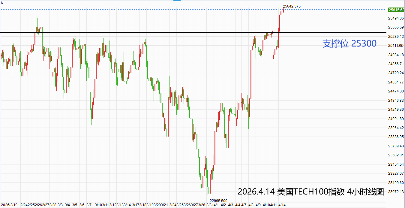 美国TECH100指数:激进者偏多操作,多单参考价25400-25500,止损位25300,获利目标25800附近/以上。
