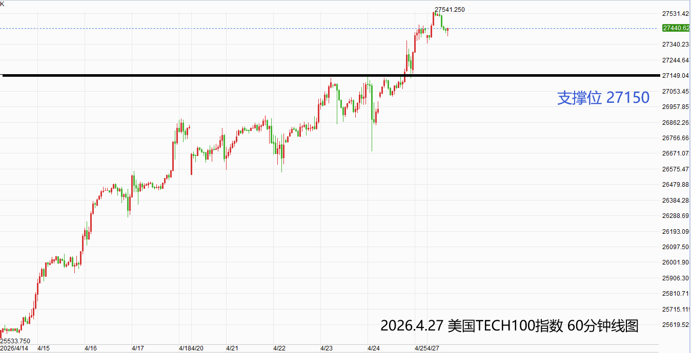 美国TECH100指数:激进者偏多操作,多单参考价位27300-27350,止损位27150,获利目标27700附近/以上。