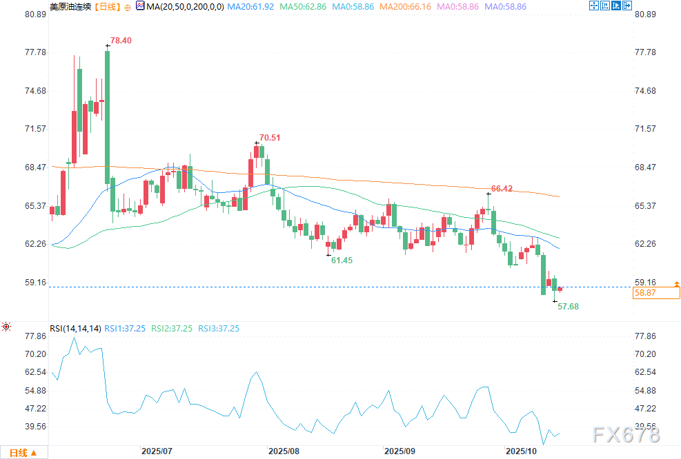 周三(10月15日),WTI原油期货价格小幅走高。日线图整体呈现出波动的态势,在盘中有多次明显的冲高和回落,价格在一定区间内震荡。此前原油价格连续多日大幅下跌,交易员正试图稳定市场。周二,油价触及57.68美元的低点,较10月8日62.92美元的峰值出现大幅回落,当前的小幅反弹自此低点开始。尽管周三盘中油价略有走强,但整体市场基调仍保持谨慎。