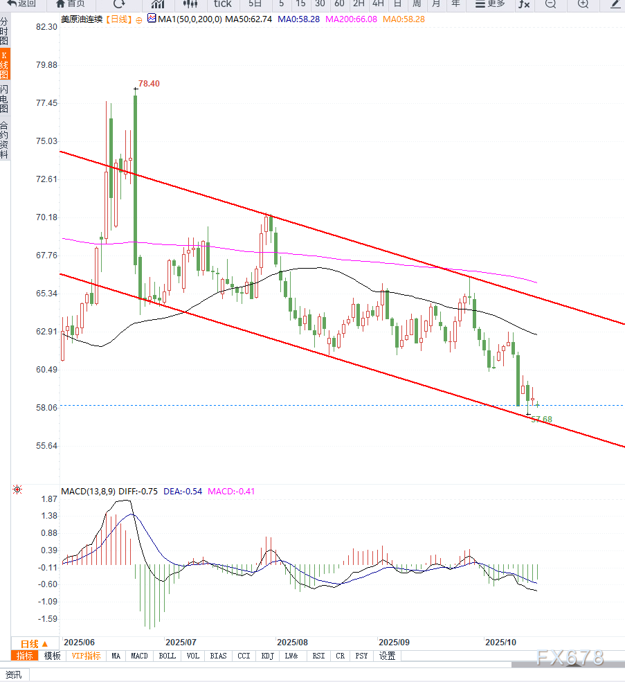 美原油周四亚盘时段小幅反弹但依然处于下行趋势之中,交投于58.30美元/桶附近,市场整体维持震荡偏弱格局,投资者对全球供应过剩的担忧情绪仍主导走势。