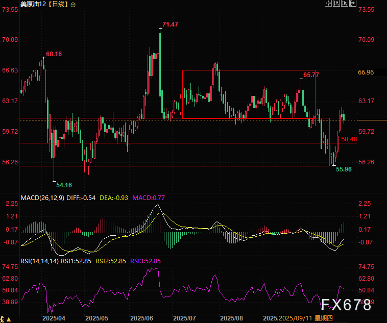 周一(10月27日)亚欧时段美原油12月期货合约开启了调整模式,一度跌1.06%,目前交投于61.10附近跌幅收窄至-0.65%,上周布伦特原油和美原油分别上涨8.9%和7.7%,表面受到美俄地缘政治,美国限制俄石油公司影响。