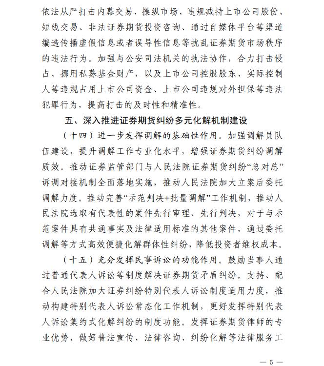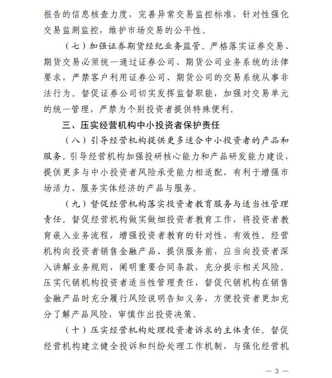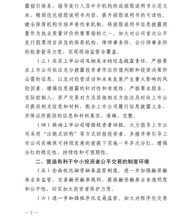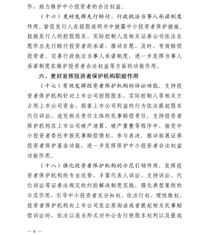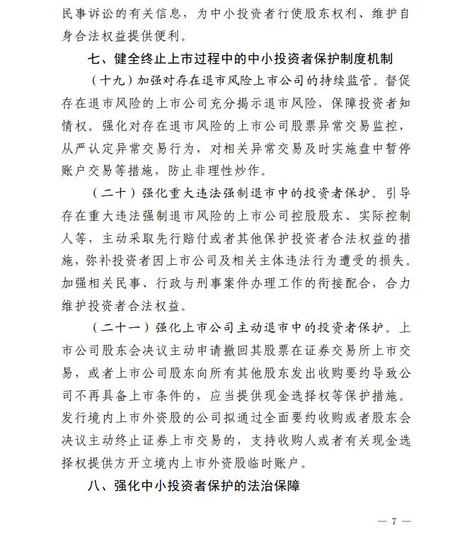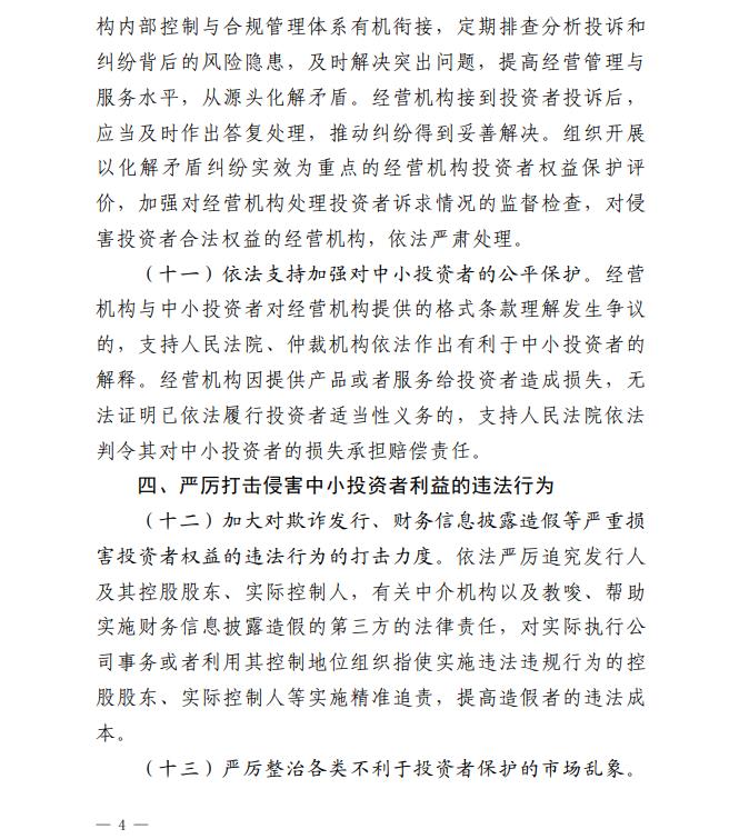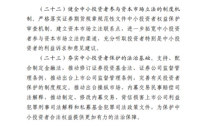 《若干意见》按照“针对核心关切、力求务实管用、于法有据”的思路,聚焦中小投资者关注的重点问题,围绕强化发行上市过程中的中小投资者保护、营造有利于中小投资者公平交易的制度环境、压实经营机构中小投资者保护责任、严厉打击侵害中小投资者利益的违法行为、深入推进证券期货纠纷多元化解机制建设、更好发挥投资者保护机构职能作用、健全终止上市过程中的中小投资者保护制度机制、强化中小投资者保护的法治保障等八个方面,提出了二十三项具体措施。相关措施有利于健全投资者保护机制,增强资本市场内在稳定性,有效保护中小投资者合法权益,有力提振市场信心。