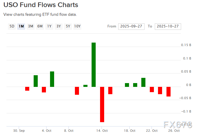 这一预期实则已体现在USO石油ETF的疲软走势中:截至10月24日,该基金连续三个交易日遭遇资金净流出,总额达3600万美元,显示机构对原油市场的短期兴趣正在消退。