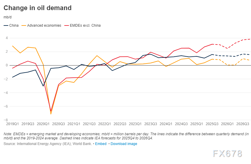 石油需求增长持续疲软。2025年第三季度,全球石油需求预计仅增加80万桶/日(mb/d),同比增幅0.7%,这表明相较于2015-2019年的平均水平,需求增长仍处于疲软状态。这一趋势预计将持续,2025年全球石油年需求量将达1.038亿桶/日,2026年将达1.045亿桶/日。