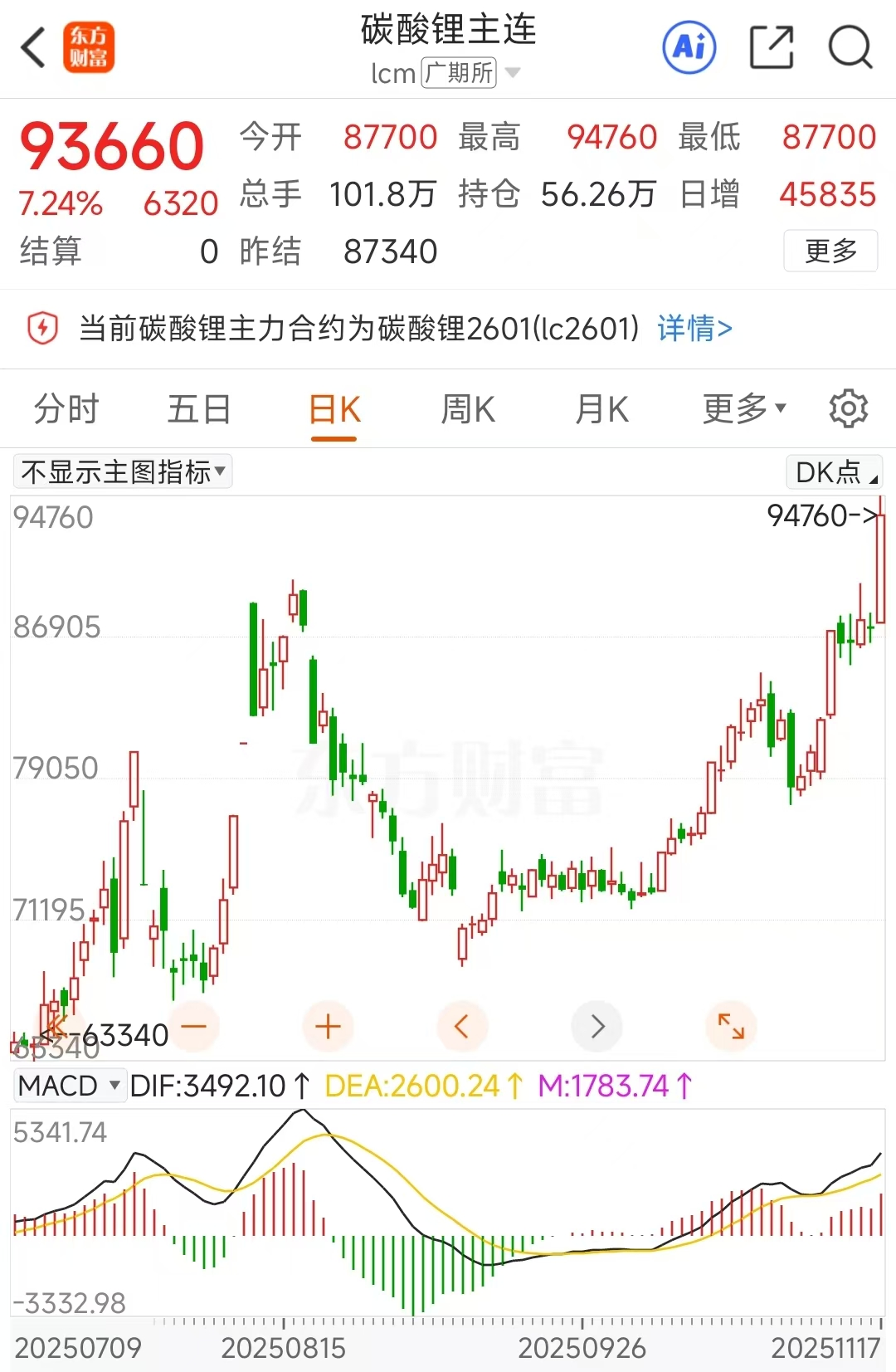 在期货市场上,碳酸锂连续主力合约近期也大幅拉升。碳酸锂主连11月17日早盘一度大涨超8%。自9月10日跳空大跌开始,迄今已累计上涨25.99%。