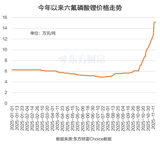 东方财富Choice数据显示,六氟磷酸锂11月14日报价15.15万元/吨,较今年7月中下旬的4.93万元/吨大涨207.3%。