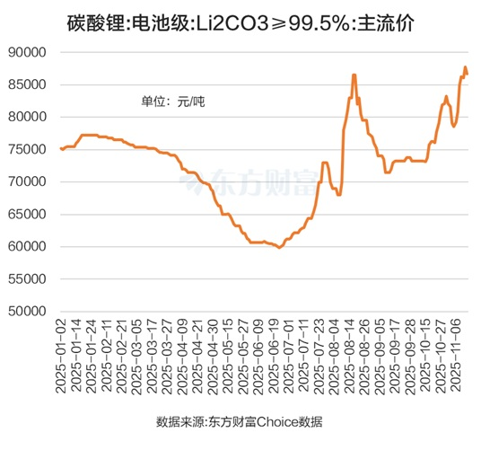 一段时间以来,电池级碳酸锂的价格涨势明显。隆众资讯的数据显示,11月14日电池级碳酸锂(Li2CO3≥99.5%)的主流价报86750元/吨,这较9月中旬的71500元/吨,约两个月时间大涨21.33%。