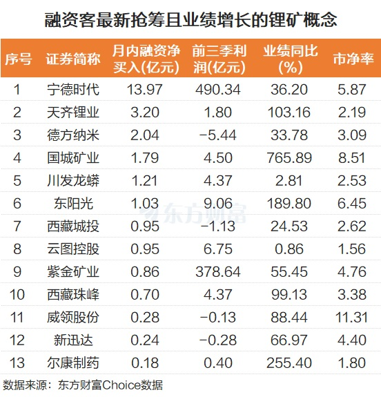 而这一切,最终都将反馈到源头,即锂矿概念成为了市场追捧的对象。从杠杆资金角度来看,11月以来,宁德时代被融资净买入13.97亿元。天齐锂业紧随其后,被融资净买入3.2亿元。德方纳米、国城矿业、川发龙蟒、东阳光也被融资净买入过亿。