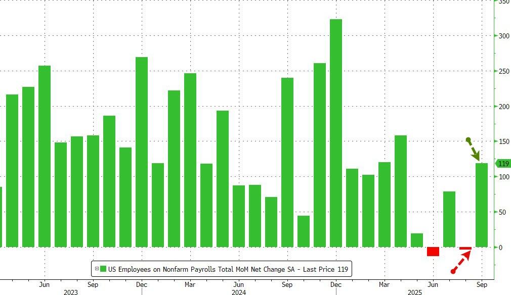 美东时间周四,美国劳工统计局公布的数据显示,美国9月非农就业意外大增11.9万人,显著高于市场预期的5万人。报告发布后,美国股指期货涨幅扩大,美国国债收益率全线走低,交易员继续押注美联储不会在12月的会议上进一步降息。