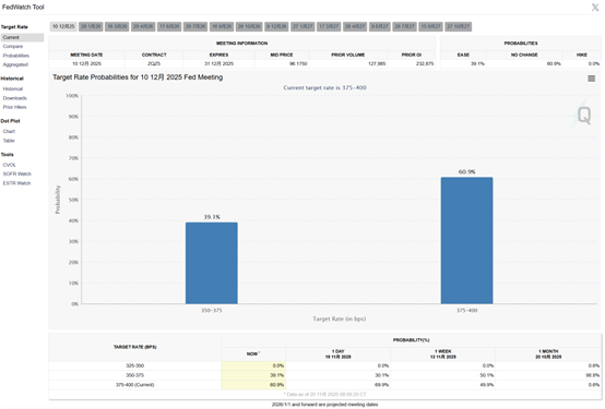 交易员仍押注美联储12月不会降息。据CME“美联储观察”,当前美联储12月降息25个基点的概率为39.1%,而维持利率不变的概率为60.9%。