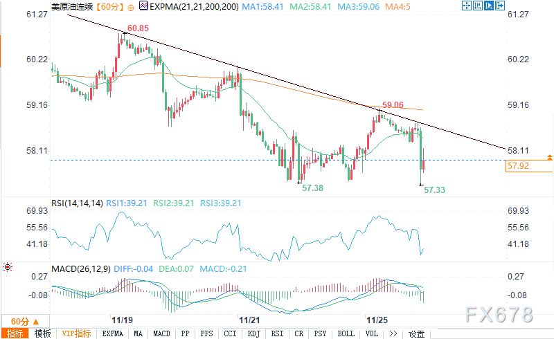 周二(11月25日)欧盘时段,WTI原油价格走软,市场呈现典型的假期前交易特征:成交量稀薄、波动震荡,投资者不愿大举押注。上周五油价触及57.38美元/桶(10月末以来最低水平)后,期货价格逐步回升至58.44-59.23美元的短期回调区间。尽管脱离近期低点,但反弹力度缺乏明确动能支撑。