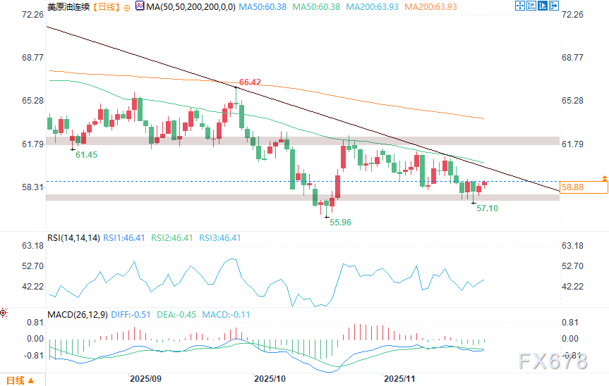 周四(11月27日)欧盘时段,西德克萨斯中质原油(WTI)期货小幅回升约0.5%。WTI原油价格盘中报58.93美元/桶,布伦特原油(Brent)盘中报62.64美元/桶。