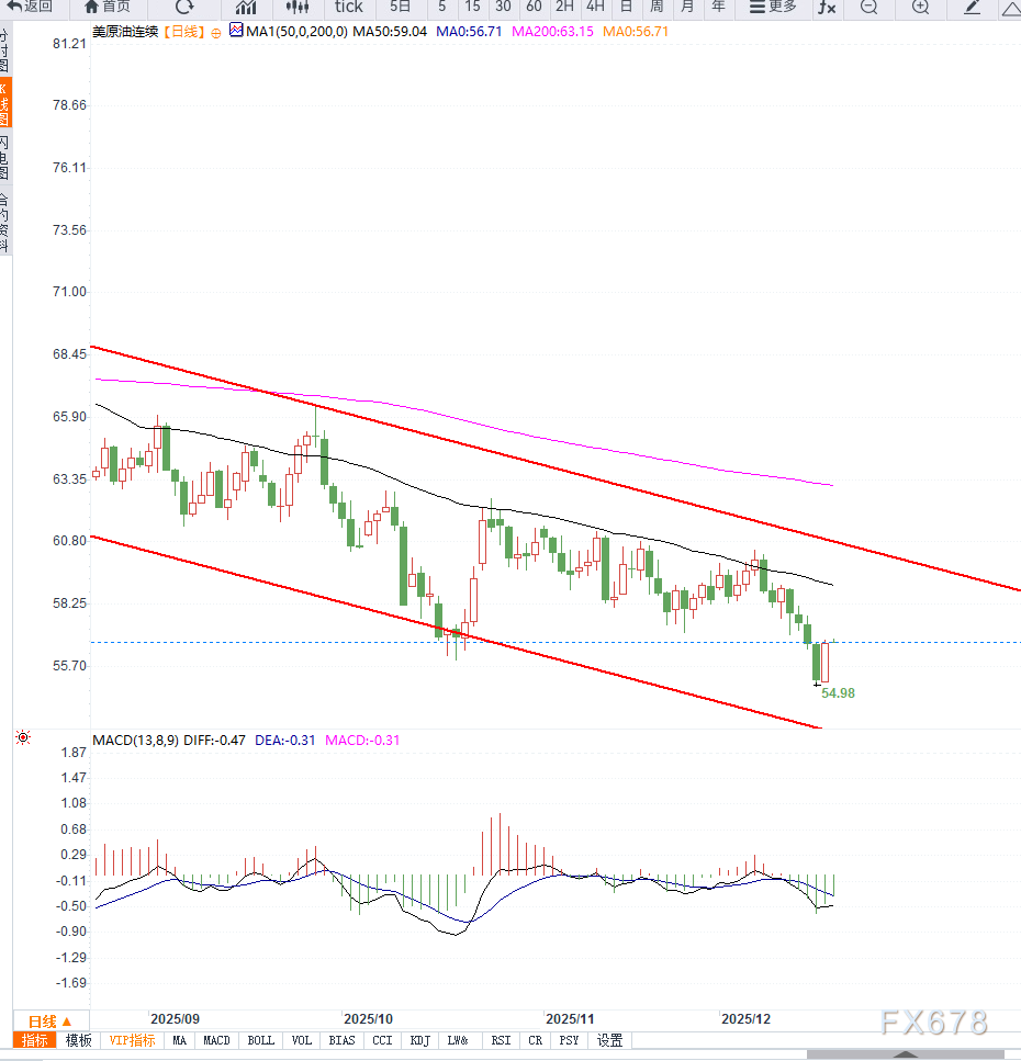 从日线图形来看,WTI原油在跌至四年半低点后出现技术性反弹,但整体趋势仍偏弱。价格此前连续跌破多条中长期均线,目前仍运行在20日、50日及100日均线下方,均线呈现空头排列,显示中期下行趋势尚未扭转。