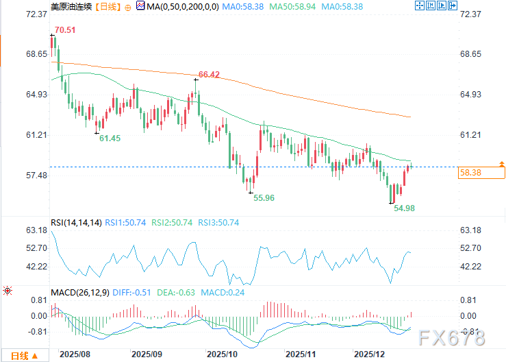 周四(12月24日)美盘时段,在因假日缩短的交易时段内WTI原油期货小幅走高,但市场未能延续涨势。价格一度触及58.62美元的50%回撤位,并尝试向58.94美元的50日平均线靠近,不过当日日内最高价仅为58.75美元,未触及50日均线这一关键阻力位。随后买家兴趣消退,走势陷入横盘。WTI原油期货盘中价格为58.34美元/桶,跌幅0.07%。交易商正密切关注50均线——若后续能有效突破该水平,可能迅速改变市场基调。