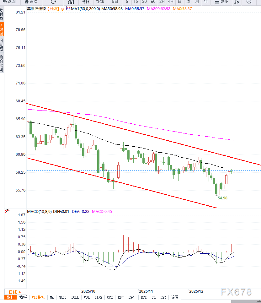 从技术面来看,美原油日线级别仍处于明确的下降趋势中。价格运行在中长期均线下方,5日、10日及20日均线呈空头排列,对油价构成持续压制。此前跌破60美元/桶关键心理关口后,WTI未能有效收复,显示下方买盘承接力度有限。