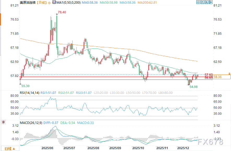周二(12月30日)美盘时段,原油价格在关键平均线下方盘整,市场动向由新闻头条主导,轻质原油期货价格小幅走高,当前价格在50日移动平均线(58.76美元)下方窄幅盘整。该均线既是价格上行的阻力位,也是可能触发价格加速上涨的关键点位。