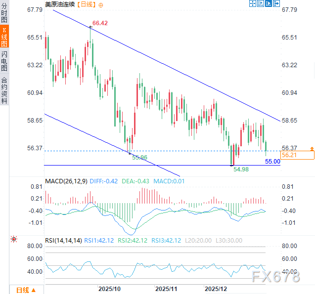周三(1月7日)亚欧时段,美原油价格震荡下行,延续前一交易日跌势,日内跌幅约1.63%,现交投于每桶56.20美元附近。此前美国总统特朗普透露委内瑞拉将向美国移交3000万至5000万桶原油。随着交易员根据新地缘政治动态重新调整供应预测,油价承压下行。
