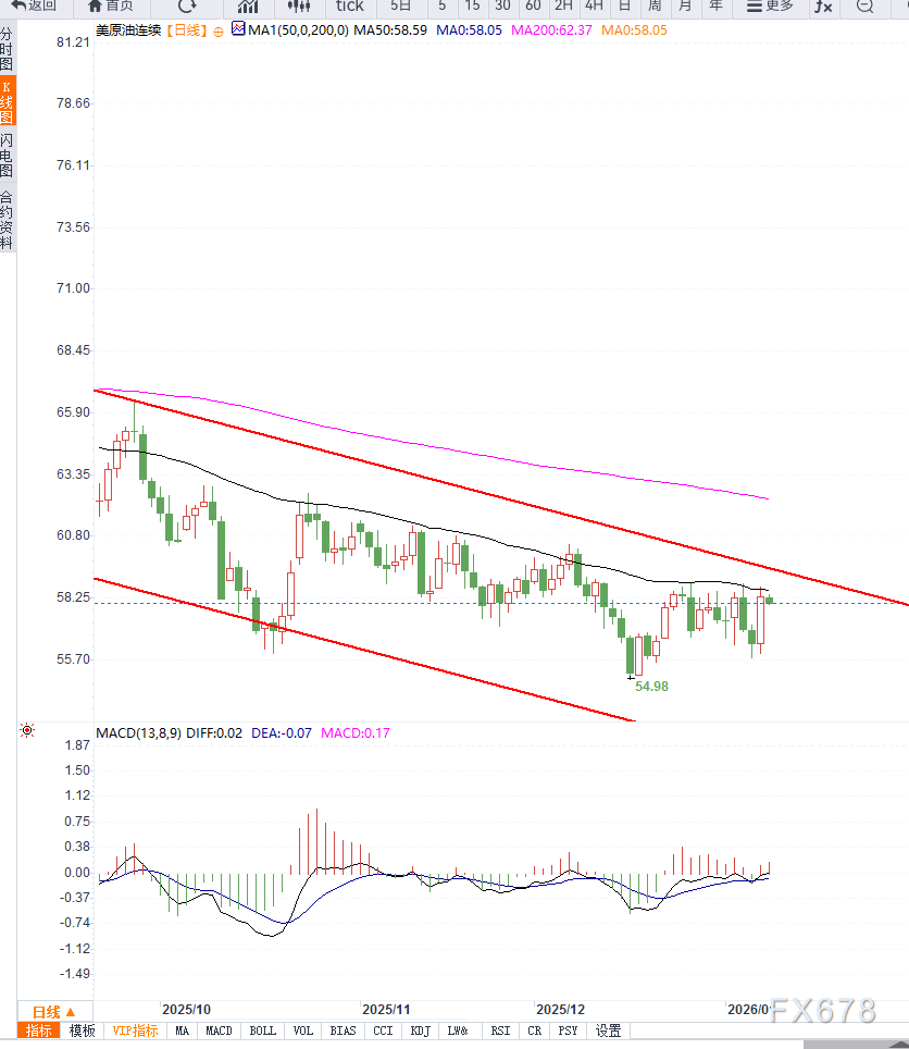 MACD绿柱持续缩短,快慢线存在低位金叉的潜在迹象。整体而言,只要油价守住56.5–57美元关键支撑区间,短线仍具备向上测试60美元整数关口的技术条件,但61–62美元区域仍将构成阶段性压力带。