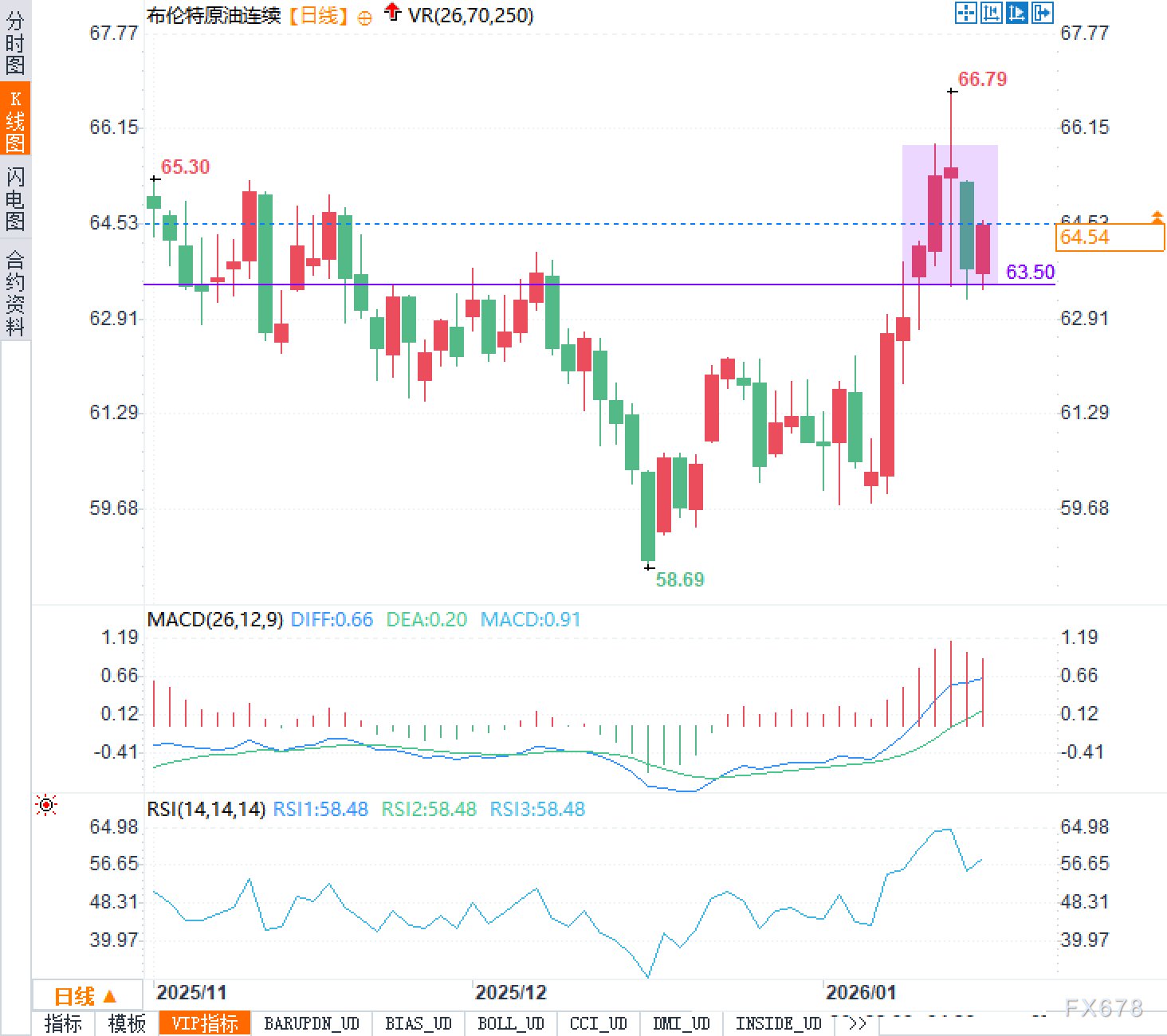从技术图形看,布伦特原油正处于关键调整阶段。日线图显示,本轮上涨触及66.79美元后遇阻回落,目前在64.50美元附近整理。上方高点压力显著,若无新的地缘升级或现货收紧证据,突破难度较大。而下方63.50美元一线被视为短线风控位,一旦跌破,可能触发趋势型资金进一步减仓,甚至引发加速下探。更下方的58.69美元则是中期重要支撑区域,对应低点水平,具有较强心理和技术意义。