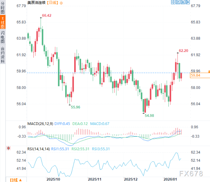 法国财政部长周五(1月16日)发出严厉警告,称美国试图控制格陵兰岛可能会严重损害与欧盟的贸易关系。分析人士认为,美国任何旨在向丹麦施压的制裁或关税都可能升级为全面贸易战。周五欧市时段,美原油价格震荡上行,日内涨幅约1.3%,现交投于每桶59.85美元附近。