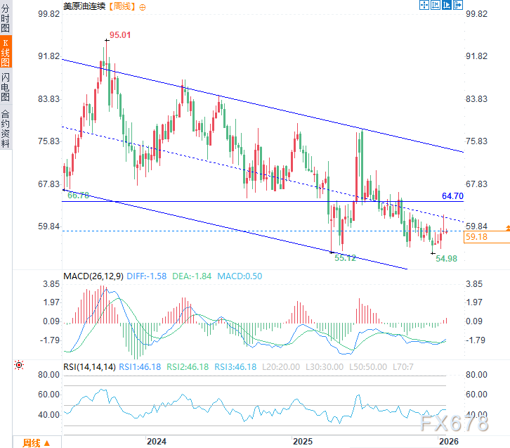 周二(1月20日)欧市时段,美原油价格震荡下行,日内跌幅约0.3%,现交投于每桶59.15美元附近,因伊朗局势趋稳,避险买盘部分消退,市场关注从短期地缘政治风险转移向长期结构性供需压力,油价承压下行。