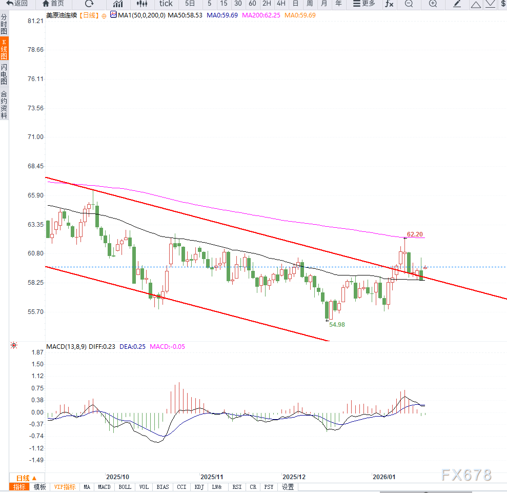从技术面来看,美原油(WTI)日线走势仍显示出震荡偏弱的特征。价格运行在中期下降通道内,前期反弹多次在关键均线及前高附近受阻,显示上方抛压依然存在。