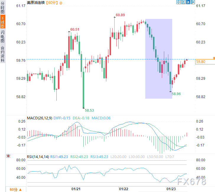 周五亚市时段,美原油价格震荡反弹,现交投于每桶59.75美元附近,日内涨幅约0.7%。此前一个交易日曾因和平委员会消息带来的风险溢价部分消退导致震荡下行,但多方地缘风险仍支撑了油价于周五的反弹。
