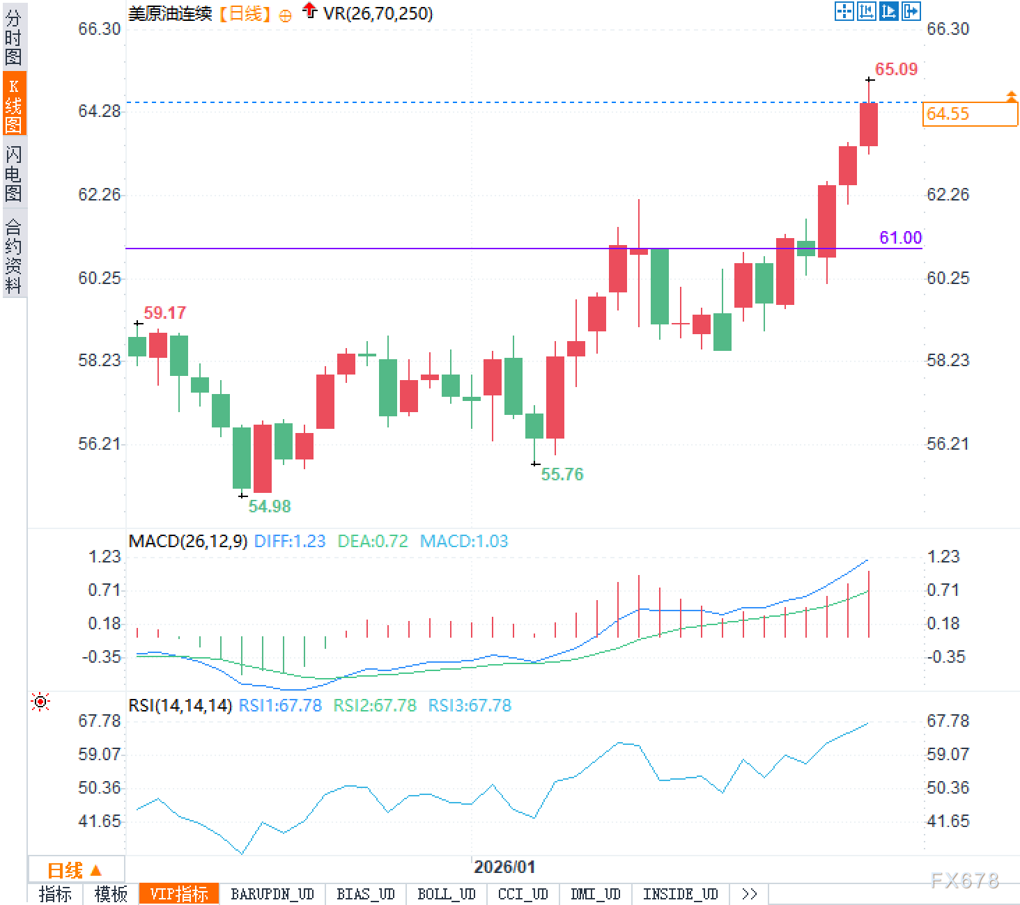 这种多空拉扯下,分析认为在技术面已经偏热的情况下,追涨风险正在累积。从日线结构看,价格已站稳61.00美元这一关键支撑位,目前正逼近65.09美元的前高区域。MACD指标显示DIFF为1.23,DEA为0.72,MACD柱扩大至1.03,均处于零轴上方且动能仍在增强,说明多头仍占主导。但RSI已达67.78,接近70的超买区间,提示短期上涨动能过快,后续可能出现横盘整理或小幅回调来消化压力。