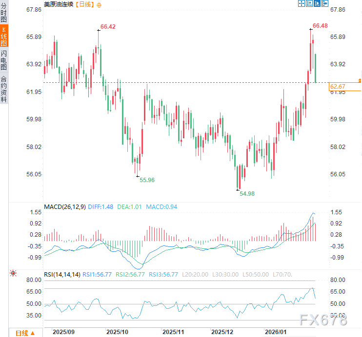 周一(2月2日)亚市时段,美原油价格震荡下行,现交投于每桶62.50美元附近,日内跌幅约4%。