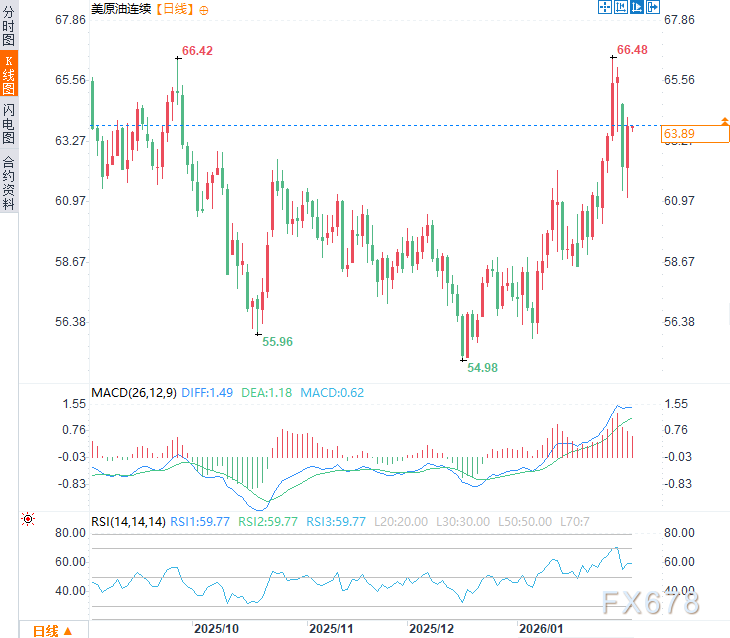 周三(2月4日)亚市时段,美原油价格震荡上行,延续了前一交易日涨势,现交投于每桶63.90美元附近,日内涨幅约1%。在美伊军队在海空领域似乎针锋相对后,市场对紧张局势升级的担忧加剧,油价小幅走高。
