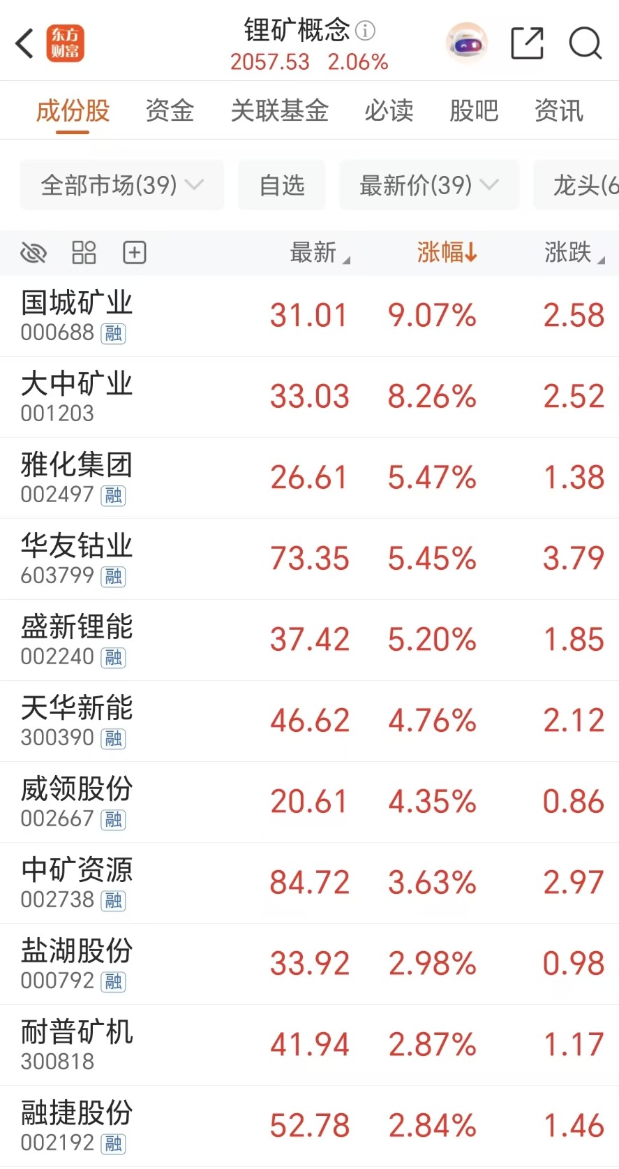 中矿资源、赣锋锂业、西部矿业、西藏珠峰、亿纬锂能、云图控股、东阳光等个股融资净买额在6亿元至1亿元之间不等。