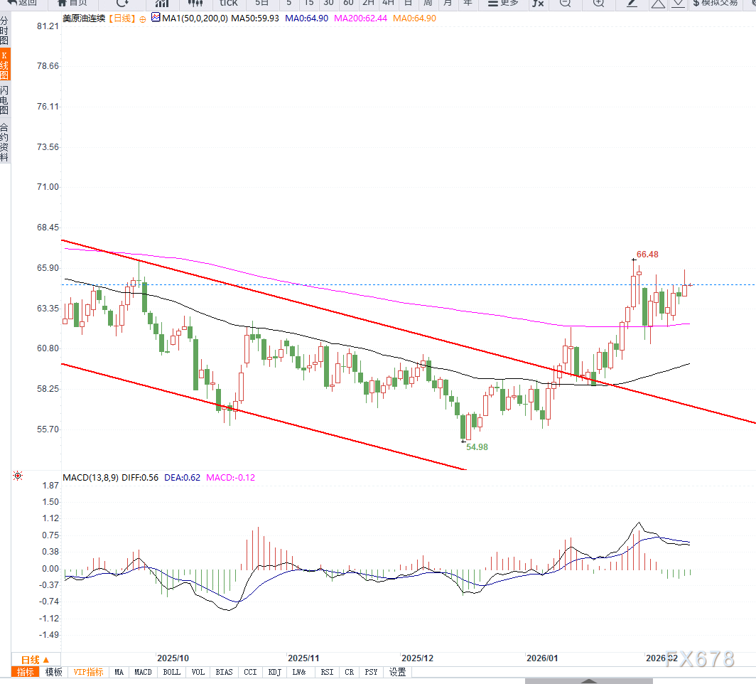 从日线结构来看,WTI原油整体维持在上升通道之内运行,近期价格自60美元附近反弹后连续收出阳线,重新站上50日与100日均线,均线系统呈现多头排列格局,表明中期趋势仍偏强。