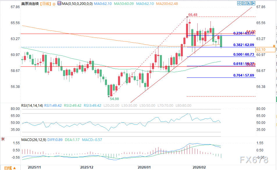 主要支撑区间:59.29-60.83美元/桶(叠加两条均线),当前油价仍在区间上方,跌破将打开进一步下行空间。