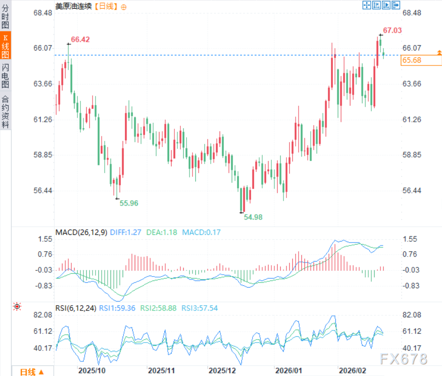 美伊核谈判重启为中东紧张局势带来一丝缓和迹象,短期内或对油价形成下行压力。周一欧市时段,美原油价格震荡下行,延续前一交易日跌势,现交投于每桶65.65美元附近,日内跌幅约1.25%。