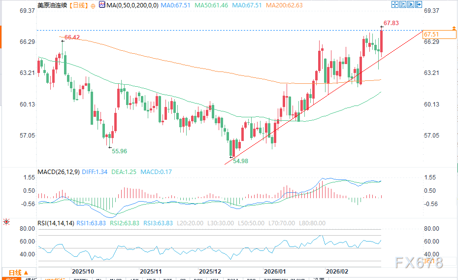 周四油价跌破关键趋势线至63.60美元,今日买盘强势将价格拉回该关键指标65.56美元上方。买盘同时突破周一高点67.28美元,上行动能增强,有望挑战前期高点68.11美元与69.37美元。