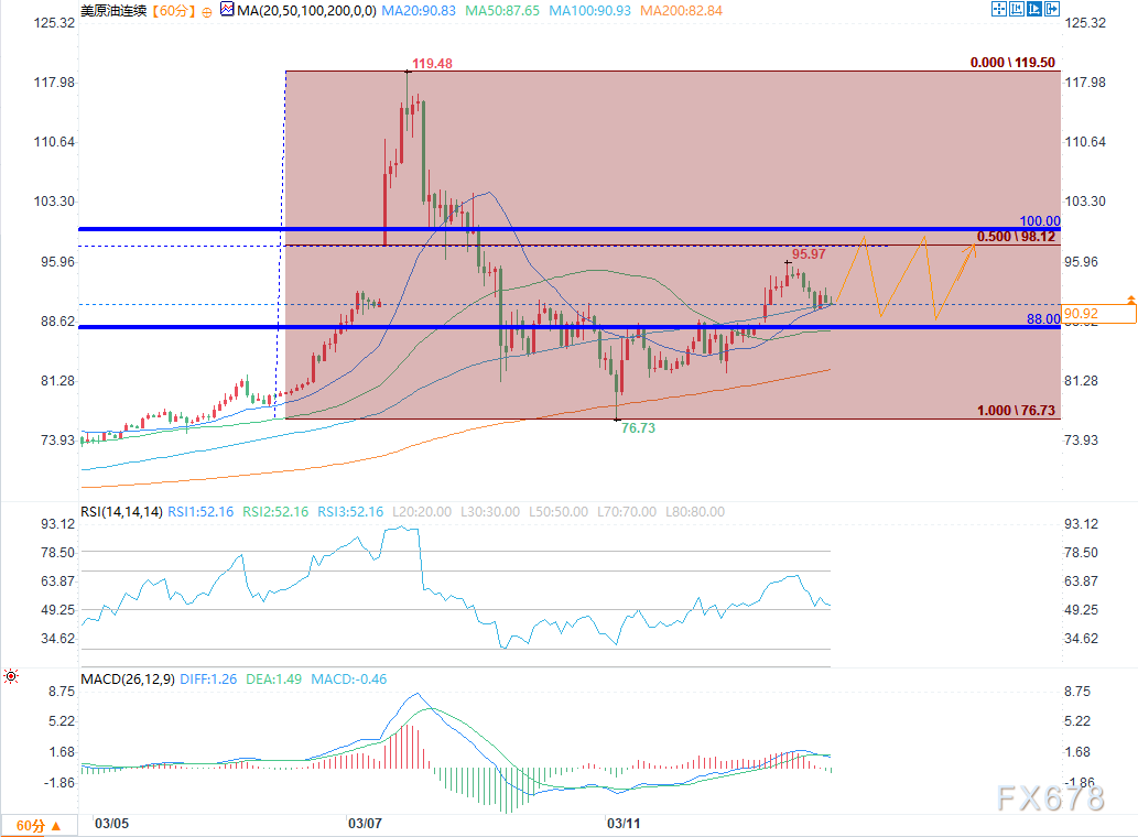 未来WTI原油价格或将在88.00–100.00宽幅区间震荡。其中,从119.48高点到76.73低点下跌幅度的下跌50%位置约为98.12,与100.00整数关口形成上方强阻力带;MA50在88美元附近,成为区间下沿的有力支撑。