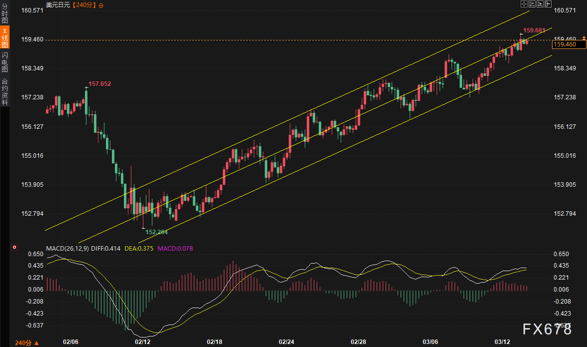 阶梯式上行:自2月12日触及152.284的低点后,汇价沿着一个标准的黄色上升通道稳步走高。其特征表现为低点不断抬升,且成功收复了2月上旬的高点157.652,展现了极强的多头动能。