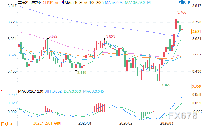 两周以来短期美债收益率大幅上升,两年期美债收益率本月已飙升31个基点,有望创下2024年10月以来最大单月涨幅,最新报3.681%,反映市场对美联储因油价上涨而难以宽松的担忧。
