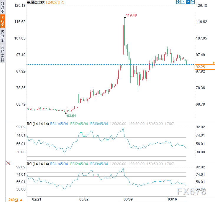 全球能源市场恐慌情绪再升温,油价高位震荡风险持续。周三亚市时段,美原油连续震荡回落,但显著高于冲突爆发前水平,现交投于每桶92.40美元附近,日内跌幅约3.25%。