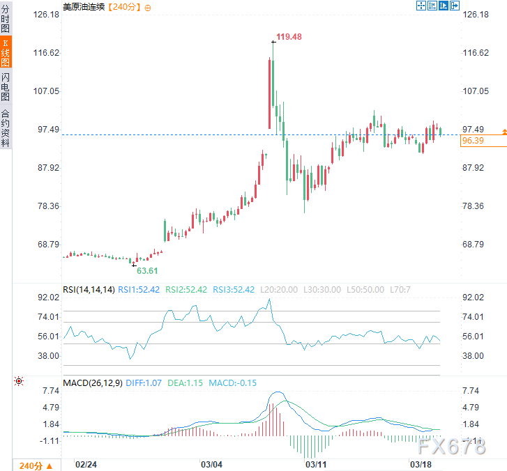 能源危机持续,油价高位震荡,周四(3月19日)亚市时段,美原油价格震荡伤心,现交投于每桶96.30美元附近,日内涨幅约0.9%。