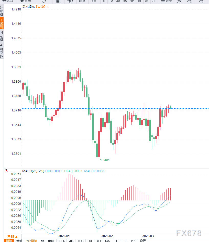 在技术面方面,从日线结构来看,USD/CAD整体仍处于震荡偏上行通道中,汇价维持在1.36上方运行,显示中期趋势仍偏多。当前价格接近前期高点区域,1.3750附近形成短期关键阻力,若突破该水平,可能进一步上探1.38区域。下方支撑位位于1.3680及1.3600区域,一旦跌破,将削弱上行结构。